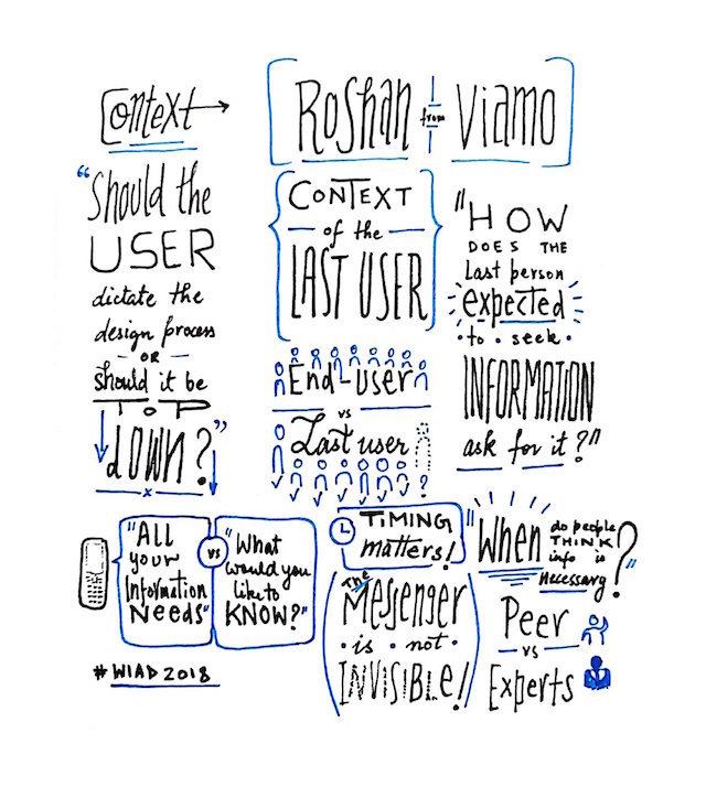 Right after lunch Roshan Nair, the Country Manager at viamo.io, introduced a new perspective to our ongoing conversations. Roshan presented 3 different examples from their work in IVRs where IA gaps emerged when the system was rolled out to last users. Roshan defined last users as the group of users present at the absolute periphery of service delivery whose needs (and context) are often overlooked by designers and information architects. IVR examples also helped our audience break away from associating IA to visual outputs.