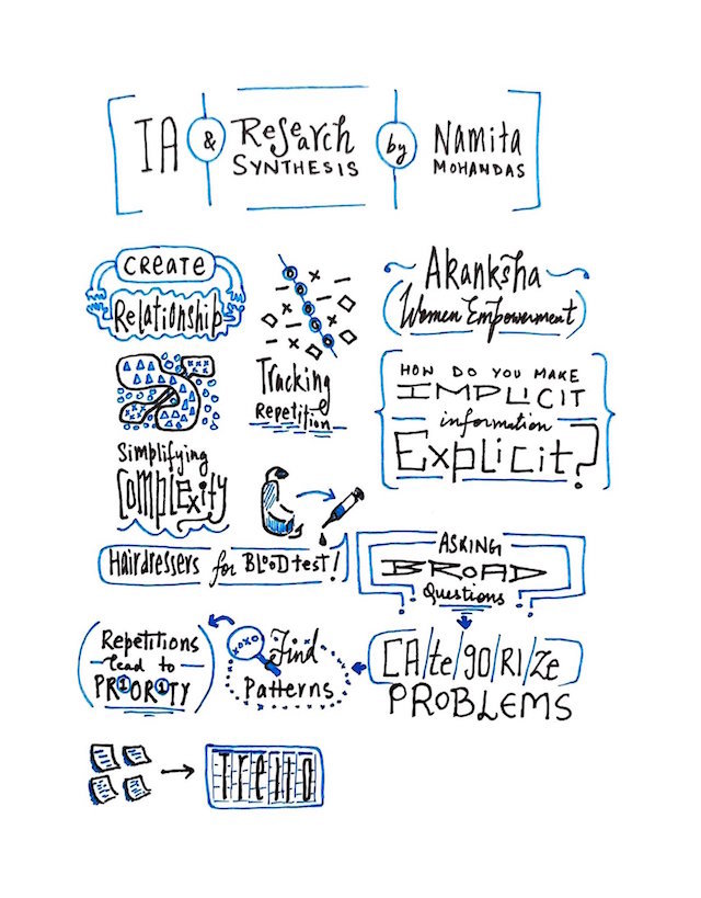 The pre-lunch talk was presented by Namita Mohandas, an independent information designer. Many a time despite investing a lot in research we’re unable to make good use of the research output, especially in understanding the problem space or connecting them with ideas or solutions. Through an example of her past work with Akanksha, Namita addressed this issue and emphasised the importance of research synthesis.