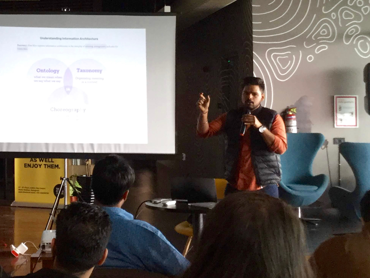 The event was kickstarted by Manish Saini, an Information Experience Designer who’s currently working at Cvent. Manish laid the ground work for the event describing how one can relate to information architecture in their work, and how to define the practice of IA. (See Manish’s slides)