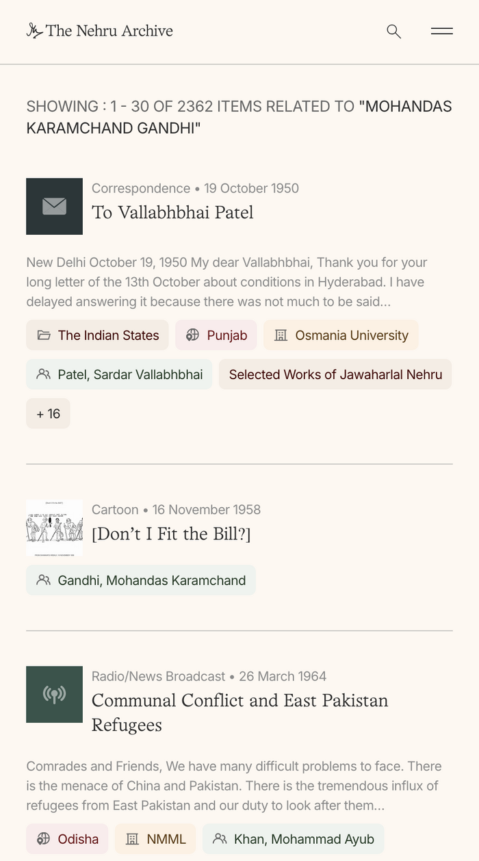 We looked at peers such as Wilson Centre Digital Archive, Churchill Archive, John F Kennedy Presidential Library and Museum Archives, Nelson Mandela Foundation Archive, and the Gandhi Heritage Portal. ↩︎