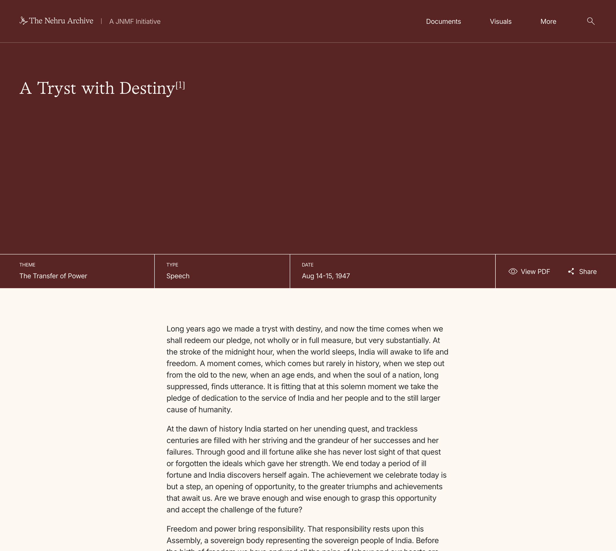 The Nehru Archive is a digital library of Jawaharlal Nehru’s letters, speeches, photographs, and more. It is a significant undertaking by the Jawaharlal Nehru Memorial Fund to create a world-class digital archive on the life, work, and thoughts of the first prime minister of India.